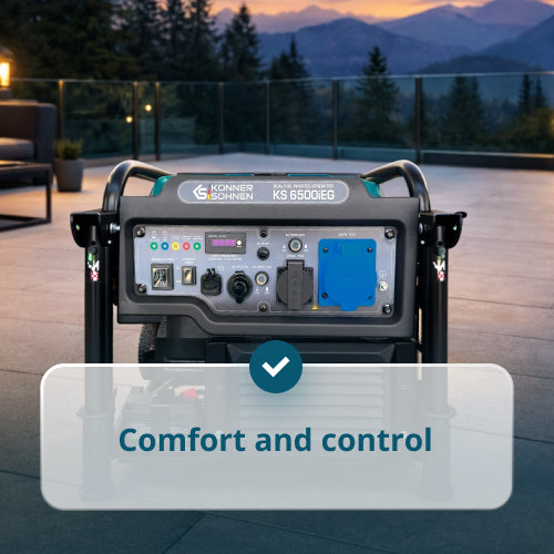 • Comfort & Control — The ergonomic control panel with a multifunctional LED display allows you to monitor all generator parameters. The panel includes indicators for low oil level, overload, voltage, and fuel type, two USB outputs, 16A and 32A sockets, and an electric start for quick and easy generator start-up, providing maximum comfort.