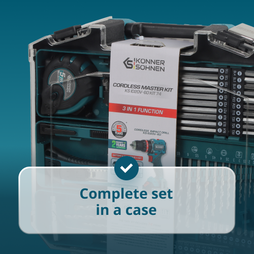 • Complete set in a case – everything you need is included: drill, 2 Ah battery, 2.4 A charger, and a set of 74 accessories — bits, drill bits, and attachments, all neatly organized in a case for easy storage, transportation, and readiness to use right after unpacking.