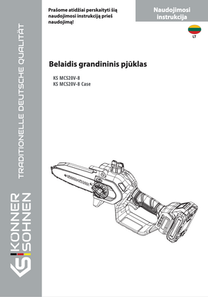 Belaidis mini grandininis pjūklas KS MCS20V-8 Case iš Vokietijos prekės ženklo Könner & Söhnen su 8” juosta (20 cm) ir 8 m/s grandinės greičiu yra galingas ir tylus įrankis sodo darbams. Bešepečiu varikliu su 5 metų garantija užtikrinamas patikimas veikimas. Pjūklas veikia su 20V baterija, kuri yra komplekte kartu su įkrovikliu, 2 juostomis ir 2 grandinėmis. Ergonomiška rankena, apsauginis skydelis, saugos užrakto mygtukas ir viršutinis dangtelis užtikrina saugumą. Greito grandinės įtempimo mechanizmas ir automatinis tepimas palengvina priežiūrą. Saugos diržo kilpa leidžia saugiai dirbti aukštyje. Idealiai tinka šakų genėjimui ir medžių priežiūrai.