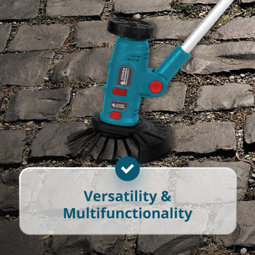 • Reguliuojamas variklio korpusas — leidžia keisti kampą ir padėtį darbui po kliūtimis. Keičiamieji darbo moduliai — atlieka tokias užduotis kaip žolės pjovimas, kraštų apipjovimas, šlavimas ir tarpų valymas.