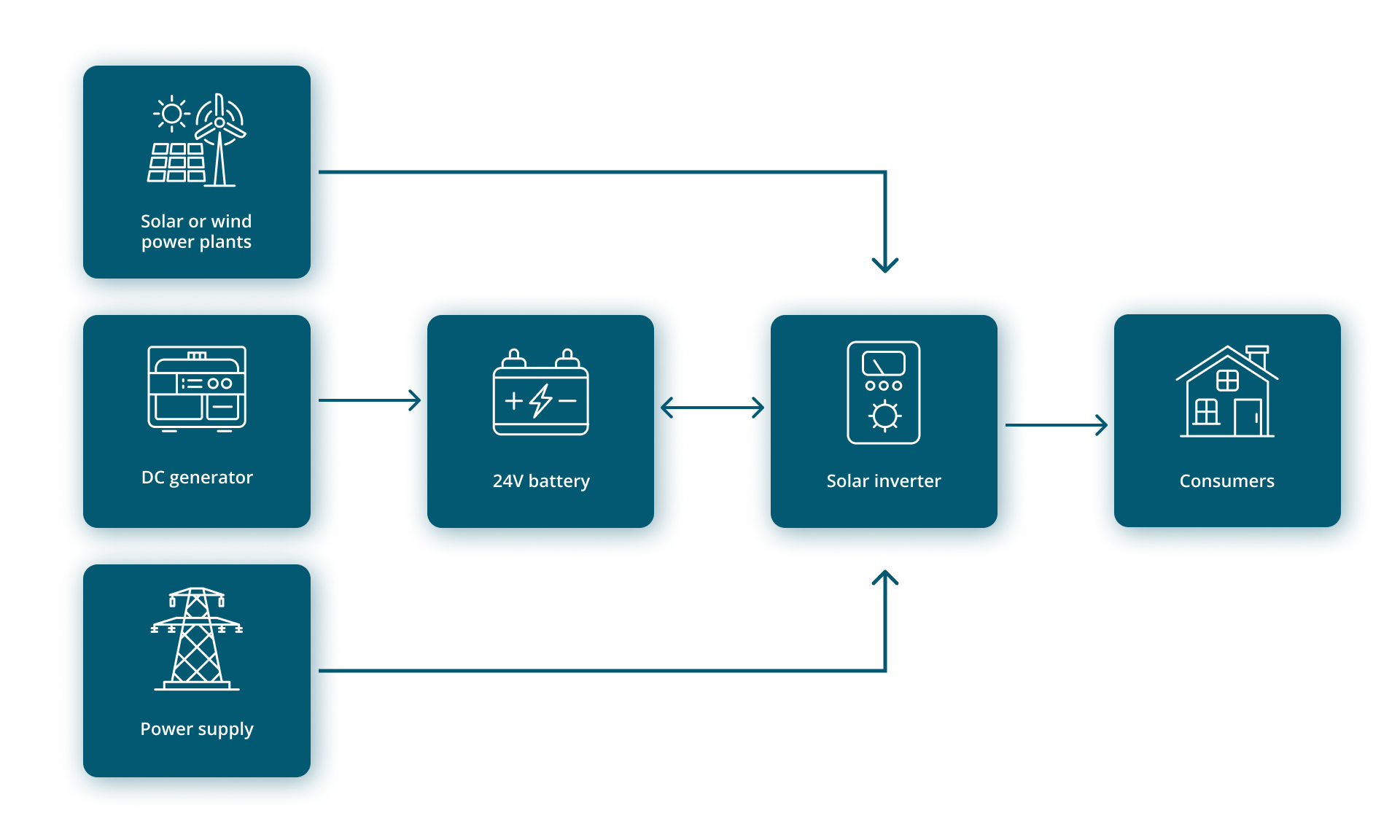 • Idealiai tinka baterijų įkrovimui 24V sistemose, tokiose kaip saulės stotys, stebėjimo ir apsaugos sistemos, taip pat baterijos priežiūrai/įkrovimui transporto priemonės stovėjimo metu ir kt.